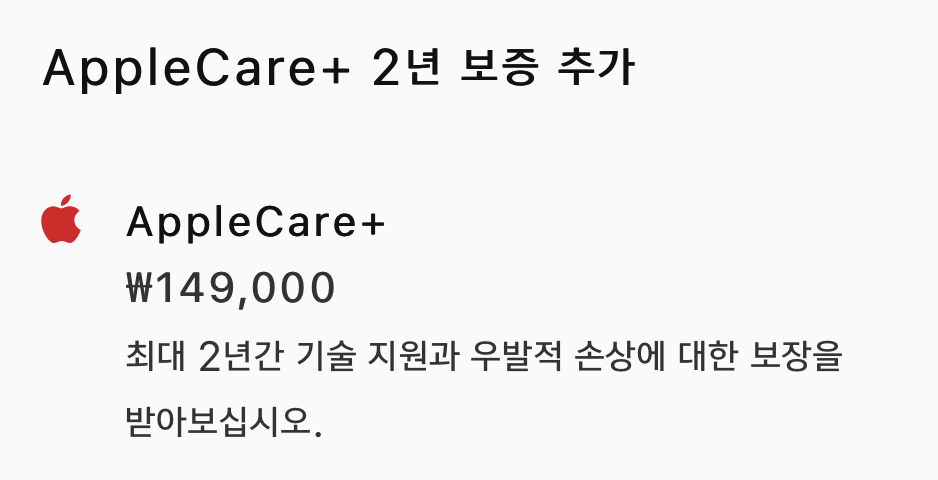 애플 보증기간을 1년에서 2년까지로 연장해주는 애플케어플러스는 14만 9천원에 추가 구매가 가능합니다.