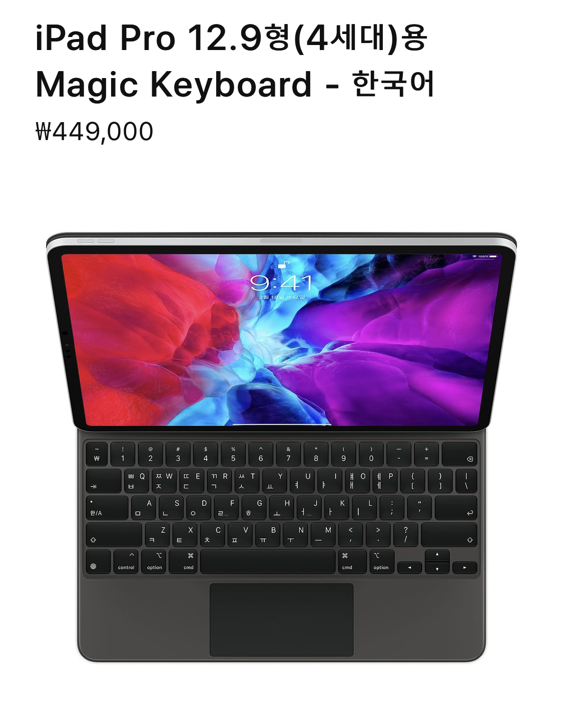 또한, 아이패드 프로 4세대와 함께 공개된 트랙패드가 탑재 된 매직키보드도 함께 구매가 가능합니다. 가격은 449,000원.