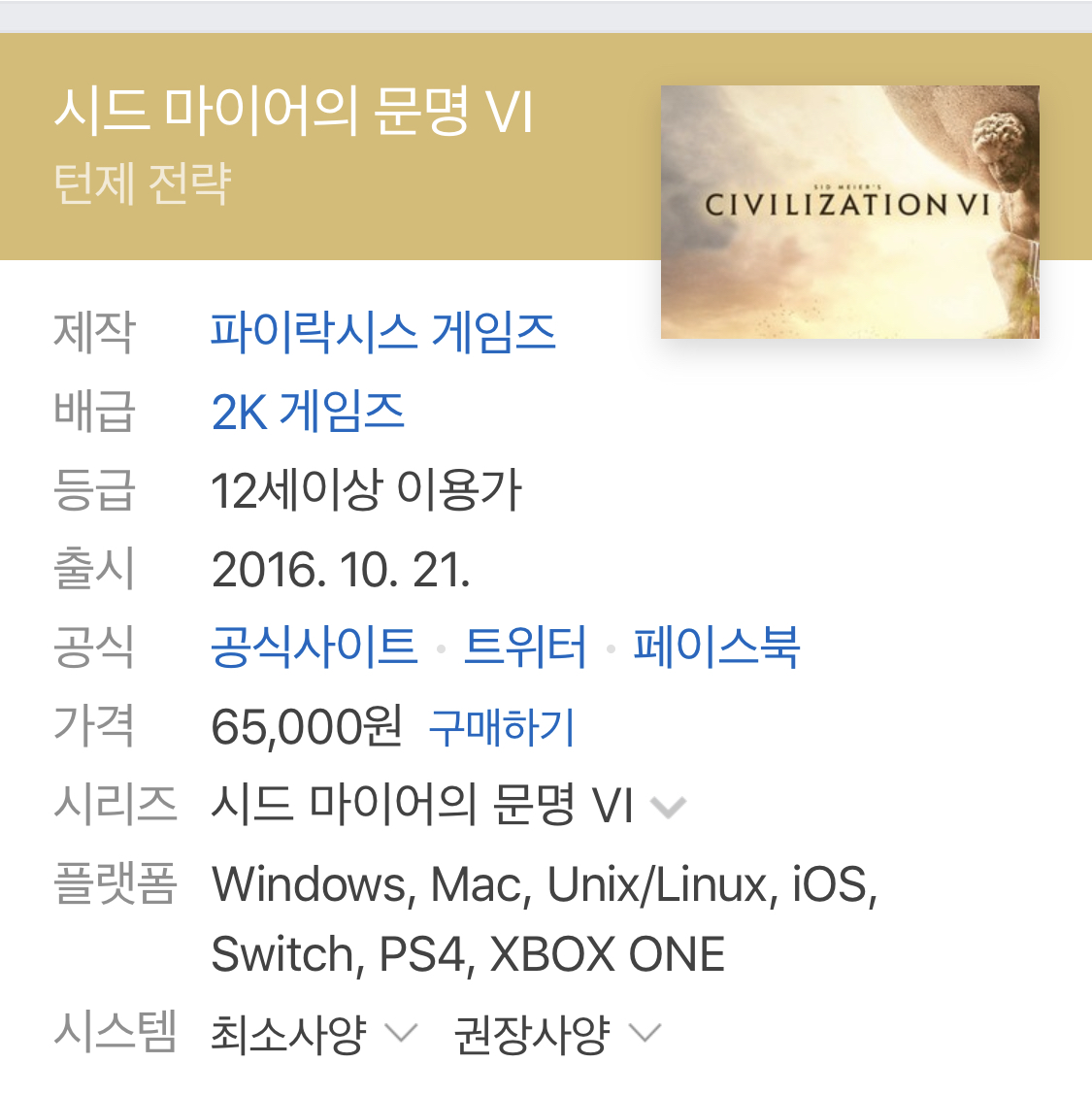 문명6는 석기 시대부터 정보화 시대에 걸쳐 제국을 건설하는 턴제 전략 시뮬레이션 게임 문명 시리즈 최신작이다. 2016년 ‘올해의 게임(Game Of The Year, GOTY)’을 수상했고, 평론 사이트 메타크리틱에서 88점을 기록하고 있다.