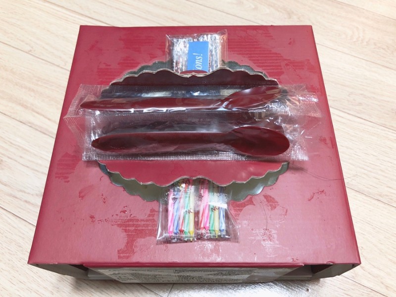 아이스크림 케이크 박스를 들어내 보면 하단에 숫가락과 생일초까지 가지런히 잘 들어있습니다. 제가 주문을 해본건 아니지만 생일초의 갯수를 정확히 입력하거나 하는건 아닌거 같습니다. 큰초와 작은초 뭉치로 포장되어 있더라구요ㅎㅎ 물론 많이많이 남았습니다.