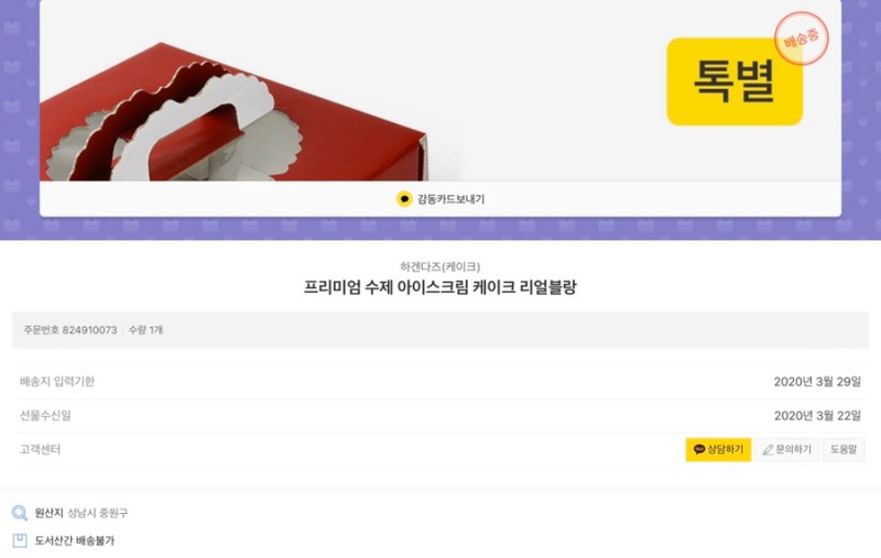 문자로 하겐다즈 수제 케이크 도착 소식을 듣게 되어 확인해보니 정말 문앞에 케이크 박스가 턱~하니 도착을 해있었습니다. 배송 또한 속전속결이었습니다.